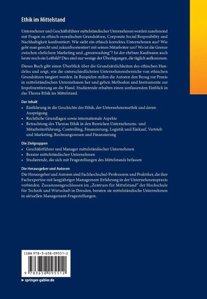 Dieses Buch gibt einen Überblick über die Grundsätzlichkeiten des ethischen Handelns und zeigt, wie die unterschiedlichsten Unternehmensbereiche von ethischen Grundsätzen tangiert werden. In Beispielen stellen die Autoren den Bezug zur Praxis in mittelständischen Unternehmen her und geben Methoden und Instrumente zur Impelmentierung an die Hand. Studierende erhalten einen umfassenden Einblick in das Thema Ethik im Mittelstand.