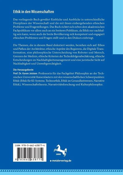Das vorliegende Buch gewährt Einblicke und Ausblicke in unterschiedliche Disziplinen der Wissenschaft und die mit ihnen einhergehenden ethischen Probleme und Fragestellungen. Das Buch richtet sich neben dem akademischen Fachpublikum vor allem auch an ein breiteres Publikum, da Ethik nur nachhaltig sein kann, wenn auch die breite Bevölkerung sich kompetent und engagiert ethischen Problemen und Fragen stellt und in den Diskurs einbringt. Die Themen, die in diesem Band diskutiert werden, beziehen sich auf: Ethos und Pathos der Architektur, ethische Aspekte des Regierens, die Digitale Transformation, eine philosophische Unterscheidung von Roboter und Mensch, Grenzen der Medizin, ethische Kriterien der Technikfolgenabschätzung, ethische Entscheidungen im Nachhaltigkeitsmanagement und eine juristische Sicht auf Nachhaltigkeit und Umweltgerechtigkeit.