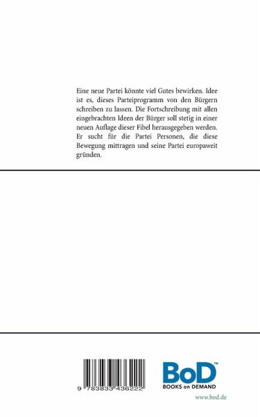 Eine neue Partei könnte viel Gutes bewirken. Idee ist es, dieses Parteiprogramm von den Bürgern schreiben zu lassen. Die Fortschreibung mit allen eingebrachten Ideen der Bürger soll stetig in einer neuen Auflage dieser Fibel herausgegeben werden. Er sucht für die Partei Personen, die diese Bewegung mittragen und seine Partei europaweit gründen.