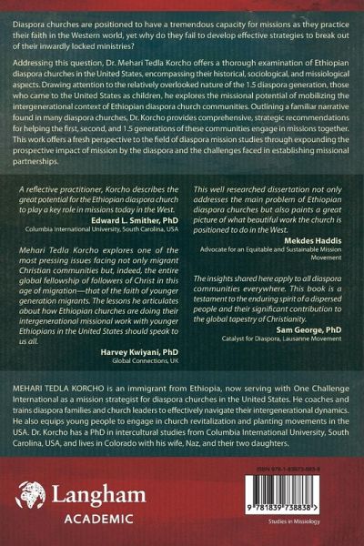 Diaspora churches are positioned to have a tremendous capacity for missions as they practice their faith in the Western world, yet why do they fail to develop effective strategies to break out of their inwardly locked ministries? Addressing this question, Dr. Mehari Tedla Korcho offers a thorough examination of Ethiopian diaspora churches in the United States, encompassing their historical, sociological, and missiological aspects. Drawing attention to the relatively overlooked nature of the 1.5 diaspora generation, those who came to the United States as children, he explores the missional potential of mobilizing the intergenerational context of Ethiopian diaspora church communities. Outlining a familiar narrative found in many diaspora churches, Dr. Korcho provides comprehensive, strategic recommendations for helping the first, second, and 1.5 generations of these communities engage in missions together. This work offers a fresh perspective to the field of diaspora mission studies through expounding the prospective impact of mission by the diaspora and the challenges faced in establishing missional partnerships.