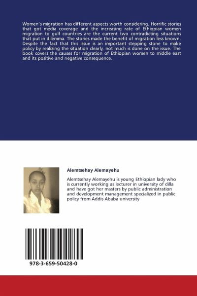 Women's migration has different aspects worth considering. Horrific stories that got media coverage and the increasing rate of Ethiopian women migration to gulf countries are the current two contradicting situations that put in dilemma. The stories made the benefit of migration less known. Despite the fact that this issue is an important stepping stone to make policy by realizing the situation clearly, not much is done on the issue. The book covers the causes for migration of Ethiopian women to middle east and its positive and negative consequence.