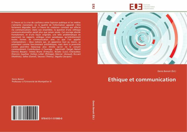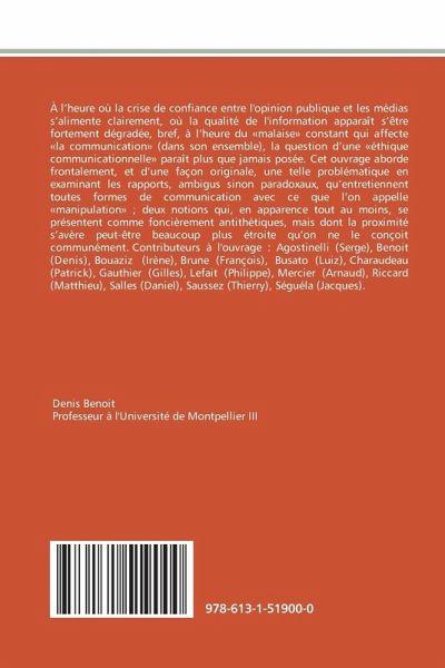 À l heure où la crise de confiance entre l'opinion publique et les médias s alimente clairement, où la qualité de l'information apparaît s être fortement dégradée, bref, à l heure du "malaise" constant qui affecte "la communication" (dans son ensemble), la question d une "éthique communicationnelle" paraît plus que jamais posée. Cet ouvrage aborde frontalement, et d une façon originale, une telle problématique en examinant les rapports, ambigus sinon paradoxaux, qu entretiennent toutes formes de communication avec ce que l on appelle "manipulation" ; deux notions qui, en apparence tout au moins, se présentent comme foncièrement antithétiques, mais dont la proximité s avère peut-être beaucoup plus étroite qu on ne le conçoit communément. Contributeurs à l'ouvrage : Agostinelli (Serge), Benoit (Denis), Bouaziz (Irène), Brune (François), Busato (Luiz), Charaudeau (Patrick), Gauthier (Gilles), Lefait (Philippe), Mercier (Arnaud), Riccard (Matthieu), Salles (Daniel), Saussez (Thierry), Séguéla (Jacques).