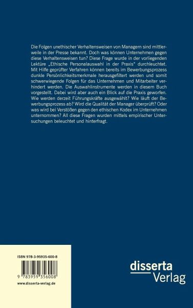 Die Folgen unethischer Verhaltensweisen von Managern sind mittlerweile in der Presse bekannt. Doch was können Unternehmen gegen diese Verhaltensweisen tun? Diese Frage wurde in der vorliegenden Lektüre "Ethische Personalauswahl in der Praxis" durchleuchtet. Mit Hilfe geprüfter Verfahren können bereits im Bewerbungsprozess dunkle Persönlichkeitsmerkmale herausgefiltert werden und somit schwerwiegende Folgen für das Unternehmen und Mitarbeiter verhindert werden. Die Auswahlinstrumente werden in diesem Buch vorgestellt. Dabei wird aber auch ein Blick auf die Praxis geworfen. Wie werden derzeit Führungskräfte ausgewählt? Wie läuft der Bewerbungsprozess ab? Wird die Qualität der Manager überprüft? Oder was wird bei Verstößen gegen den ethischen Kodex im Unternehmen unternommen? All diese Fragen wurden mittels empirischer Untersuchungen beleuchtet und hinterfragt.