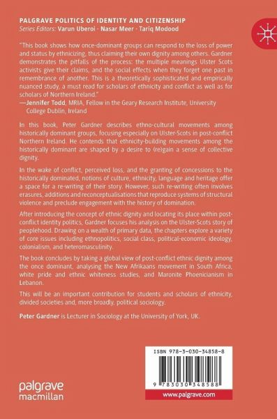After introducing the concept of ethnic dignity and locating its place within postconflict identity politics, Gardner focuses his analysis on the Ulster- Scots story of peoplehood. Drawing on a wealth of primary data, the chapters explore a variety of core issues including ethnopolitics, social class, political-economic ideology, colonialism, and heteromasculinity.