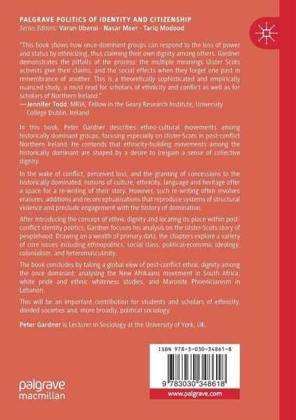After introducing the concept of ethnic dignity and locating its place within postconflict identity politics, Gardner focuses his analysis on the Ulster- Scots story of peoplehood. Drawing on a wealth of primary data, the chapters explore a variety of core issues including ethnopolitics, social class, political-economic ideology, colonialism, and heteromasculinity.