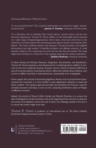 In Ethnic Identity and Minority Protection: Designation, Discrimination, and Brutalization, Thomas W. Simon examines a new framework for considering ethnic conflicts. In contrast to the more traditional theories of justice, Simon's theory of injustice shifts focus away from group identity toward group harms, effectively making many problems, such as how to define minorities in international law, dramatically more manageable. Simon argues that instead of promoting legislative devices like proportional representation for minorities, it is more fruitful to seek adjudicative solutions to racial and ethnic-related conflicts. For example, resources could be shifted to quasi-judicial human-rights treaty bodies that have adopted an injustice approach. This injustice approach provides the foundation for Kosovo's case for remedial secession, and helps to sort out the competing entitlement claims of Malays in different countries. Indeed, the priority of Thomas W. Simon's Ethnic Identity and Minority Protection is to ensure the tales of designation and discrimination told at the beginning of the work do not become the stories of brutalization told at the end. In short, the challenge tackled in this text is to assure that reason reigns over hate.