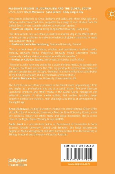 1. Introduction; Anna Gladkova and Sadia Jamil.- 2. Ethnic Journalism: Theoretical Context; Sadia Jamil and Anna Gladkova.- 3. Journalism Education and Ethnic Journalism in Ghana: The Case Study of Ghana Institute of Journalism and University of Education, Winneba; Gifty Appiah-Adjei.- 4. Mapping Ethnic Media in Egypt: An Examination of Counter-Publics, Reality, and Challenges; Sara S. Elmaghraby.- 5. Ethnic Journalism in Russia: Between Profession and Social Mission; Anna Gladkova and Elena Vartanova.- 6. 'Misafir Media': Domopolitics and Securitization of Displaced Syrian Ethnic Groups; Recep Gülmez.- 7. "Aquí no hay negros": Policies of Invisibilisation and the Impact on Afro-Descendent Media in Argentina; Suzanne Temwa Gondwe Harris.- 8. Safeguarding Ethnic-cultural Identities through Ethnic Media: The Case of Radio Dhimsa in Odisha, India; Aniruddha Jena.- 9. A "Place for Our Small Problems": Online Ethnic Media of the Turks in/from Bulgaria; Slavka Karakusheva.- 10. Ethnic Journalism as a Social Mission: An Exploration of Zimbabwe Broadcasting Corporation's (ZBC) National FM Radio Station; Trust Matsilele and Golden Maunganidze.- 11. Ma ori-Language Journalism in Aotearoa New Zealand: Balancing Cultural Values, Journalistic Norms and the Constraints of the National-Language Revitalisation Agenda; Atakohu Middleton.- 12. Ethnic Newsmaking Through Citizen Journalism: Collective Content Production of Syrian Refugees in Turkey; Glenn Muschert, Ahmet Taylan, and Duygu Özsoy.- 13. Afro-Brazilian Journalism in Alternative Media: A Study of Alma Preta; Igor Oliveira Neves, Victor Fermino da Silva, and Mateus Yuri Passos.- 14. Understanding Ethnic Journalism in an Extinguishing Print News Media Landscape: Japanese-Language Newspapers in Brazil; Jessica Retis.- 15. 'Here' and 'Back Home': Imagining Diasporic Connections Through Aotearoa New Zealand's Pacific News Media; Tara Ross.- 16. Ethnic Media and Racism in Brazil: The Case of Black Nation TV; Melina Santos and José Cláudio Castanheira.