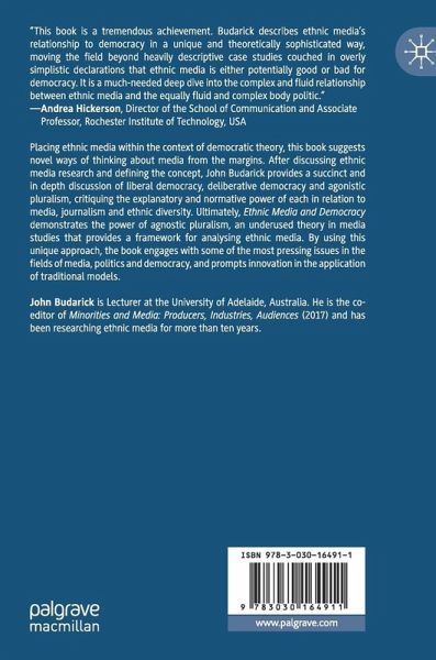 Placing ethnic media within the context of democratic theory, this book suggests novel ways of thinking about media from the margins. After discussing ethnic media research and defining the concept, John Budarick provides a succinct and in depth discussion of liberal democracy, deliberative democracy and agonistic pluralism, critiquing the explanatory and normative power of each in relation to media, journalism and ethnic diversity. Ultimately, Ethnic Media and Democracy demonstrates the power of agnostic pluralism, an underused theory in media studies that provides a framework for analysing ethnic media. By using this unique approach, the book engages with some of the most pressing issues in the fields of media, politics and democracy, and prompts innovation in the application of traditional models.