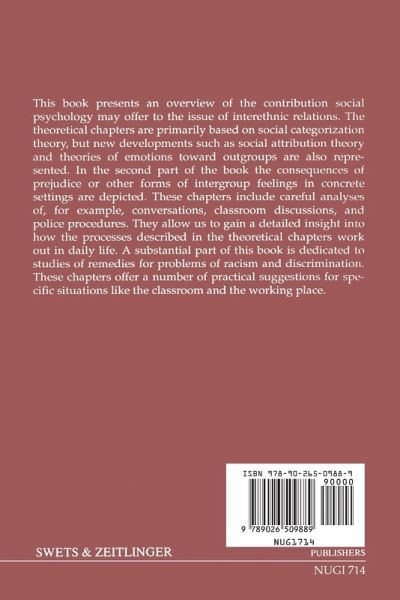 This book presents an overview of the contribution social psychology may offer to the issue of interethnic relations. It comprises three approaches: social psychological theory; description of interethnic relationships in real life settings; and the application of theories to reduce discrimination.