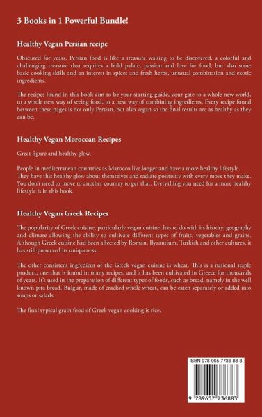 Three books in one 3 Books in 1 Powerful Bundle! Healthy Vegan Persian recipe Obscured for years, Persian food is like a treasure waiting to be discovered, a colorful and challenging treasure that requires a bold palate, passion and love for food, but also some basic cooking skills and an interest in spices and fresh herbs, unusual combination and exotic ingredients. The recipes found in this book aim to be your starting guide, your gate to a whole new world, to a whole new way of seeing food, to a new way of combining ingredients. Every recipe found between these pages is not only Persian, but also vegan so the final results are as healthy as they can be. It doesn’t even take any special cooking skills. As long as you know how to chop and turn the stove on, you are good to go. So put that apron on and go to the kitchen because there are plenty of recipes waiting to be tried, plenty of new experiences and flavors and tons of joy cooking it all by Healthy Vegan Moroccan Recipes Great figure and healthy glow. People in mediterranean countries as Marocco live longer and have a more healthy lifestyle. They have this healthy glow about themselves and radiate positivity with every move they make. You don’t need to move to another country to get that. Everything you need for a more healthy lifestyle is in this book. For example: *Sweet and Nutty Moroccan Couscous *Sweet Potato, Chickpea and Zucchini Tagine *Couscous Shepherd’s Pie And for you sweet people: *Moroccan Peaches *Moroccan Cinnamon Cookies *Moroccan Date Bonbons If you want to instantly change your lifestyle, this recipes are what you are looking for. Moroccan and vegan food is great to loose some extra pounds while you don’t need to deprive yourself from tasty foods. It’s not about eating nothing, it’s about what you eat and how you treat your body. Read, absorb and try these delicious foods. Healthy Vegan Greek Recipes The popularity of Greek cuisine, particularly vegan cuisine, has to do with its history, geography and climate allowing the ability to cultivate different types of fruits, vegetables and grains. Although Greek cuisine had been affected by Roman, Byzantium, Turkish and other cultures, it has still preserved its uniqueness. The other consistent ingredient of the Greek vegan cuisine is wheat. This is a national staple product, one that is found in many recipes, and it has been cultivated in Greece for thousands of years. It’s used in the preparation of different types of foods, such as bread, namely in the well known pita bread. Bulgur, made of cracked whole wheat, can be eaten separately or added into soups or salads. The final typical grain food of Greek vegan cooking is rice. This is used in pilafs and bakes, served with stews, or wrapped in grape leaves to make dolmades.