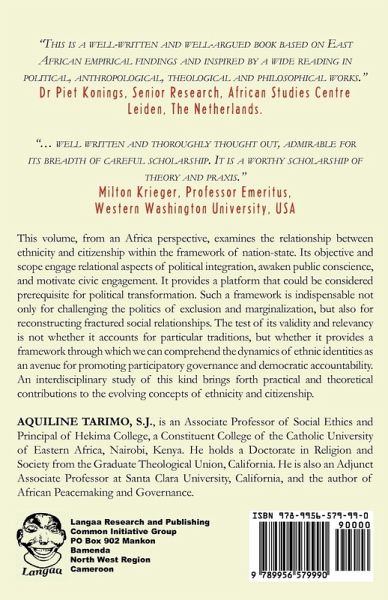 This volume, from an Africa perspective, examines the relationship between ethnicity and citizenship within the framework of nation-state. Its objective and scope engage relational aspects of political integration, awaken public conscience, and motivate civic engagement. It provides a platform that could be considered prerequisite for political transformation. Such a framework is indispensable not only for challenging the politics of exclusion and marginalization, but also for reconstructing fractured social relationships. The test of its validity and relevancy is not whether it accounts for particular traditions, but whether it provides a framework through which we can comprehend the dynamics of ethnic identities as an avenue for promoting participatory governance and democratic accountability. An interdisciplinary study of this kind brings forth practical and theoretical contributions to the evolving concepts of ethnicity and citizenship.