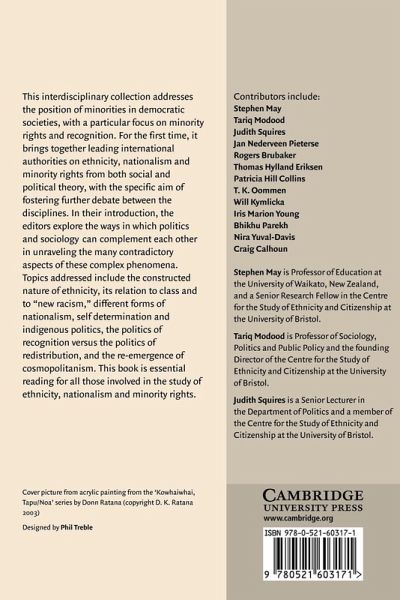 1. Ethnicity, nationalism and minority rights charting the disciplinary debates Stephen May, Tariq Modood, and Judith Squires; Part I. Ethnicity and Ethnic Groups: 2. Ethnicities and multiculturalisms: politics of boundaries Jan Nederveen Pieterse; 3. Ethnicity without groups Rogers Brubaker; 4. Ethnicity, class and the 1999 Mauritian riots Thomas Hylland Eriksen; 5. Black nationalism and African American ethnicity: the case of Afrocentrism as civil religion Patricia Hill Collins ; Part II. The State and Minority Claims: 6. New nationalisms and collective rights: the case of South Asia T. K. Oommen; 7. Justice and security in the accommodation of minority nationalism Will Kymlicka; 8. Two concepts of self determination Iris Marion Young; Part III. New Directions: 9. Recognition or redistribution: a misguided debate Bhikhu Parekh; 10. Borders, boundaries and the politics of belonging Nira Yuval-Davis; 11. Cosmopolitanism is not enough: reflections after 9/11 Craig Calhoun.
