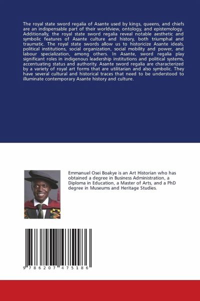 The royal state sword regalia of Asante used by kings, queens, and chiefs are an indispensable part of their worldview, ontology, and epistemology. Additionally, the royal state sword regalia reveal notable aesthetic and symbolic features of Asante culture and history, both triumphal and traumatic. The royal state swords allow us to historicize Asante ideals, political institutions, social organization, social mobility and power, and labour specialization, among others. In Asante, sword regalia play significant roles in indigenous leadership institutions and political systems, accentuating status and authority. Asante sword regalia are characterized by a variety of royal art forms that are utilitarian and also symbolic. They have several cultural and historical traces that need to be understood to illuminate contemporary Asante history and culture.