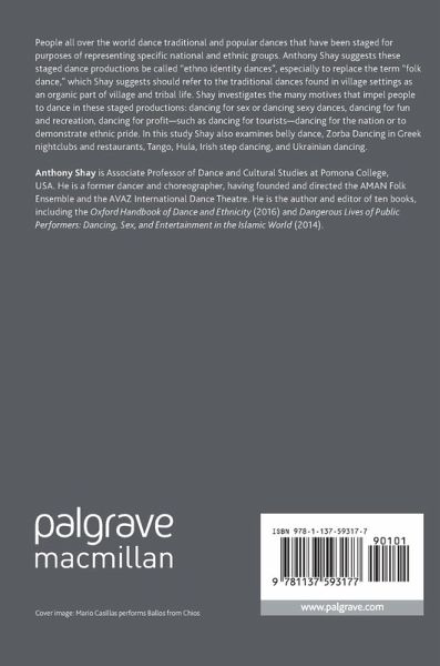 People all over the world dance traditional and popular dances that havebeen staged for purposes of representing specific national and ethnic groups.Anthony Shay suggests these staged dance productions be called "ethno identitydances", especially to replace the term "folk dance," which Shay suggestsshould refer to the traditional dances found in village settings as an organicpart of village and tribal life. Shay investigates the many motives that impelpeople to dance in these staged productions: dancing for sex or dancing sexydances, dancing for fun and recreation, dancing for profit - such as dancingfor tourists - dancing for the nation or to demonstrate ethnic pride. In thisstudy Shay also examines belly dance, Zorba Dancing in Greek nightclubs andrestaurants, Tango, Hula, Irish step dancing, and Ukrainian dancing.