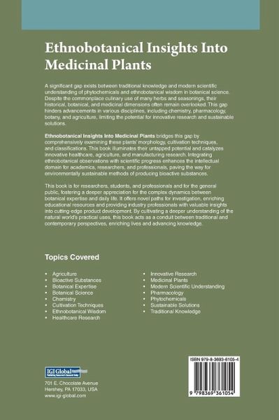 A significant gap exists between traditional knowledge and modern scientific understanding of phytochemicals and ethnobotanical wisdom in botanical science. Despite the commonplace culinary use of many herbs and seasonings, their historical, botanical, and medicinal dimensions often remain overlooked. This gap hinders advancements in various disciplines, including chemistry, pharmacology, botany, and agriculture, limiting the potential for innovative research and sustainable solutions. Ethnobotanical Insights into Medicinal Plants bridges this gap by comprehensively examining these plants' morphology, cultivation techniques, and classifications. This book illuminates their untapped potential and catalyzes innovative healthcare, agriculture, and manufacturing research. Integrating ethnobotanical observations with scientific progress enhances the intellectual domain for academics, researchers, and professionals, paving the way for environmentally sustainable methods of producing bioactive substances.