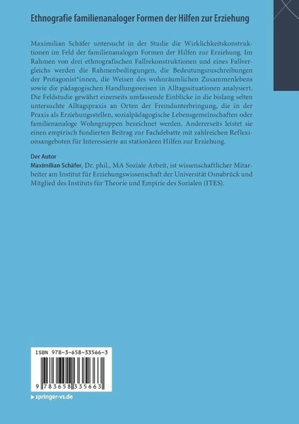 Maximilian Schäfer untersucht in der Studie die Wirklichkeitskonstruktionen im Feld der familienanalogen Formen der Hilfen zur Erziehung. Im Rahmen von drei ethnografischen Fallrekonstruktionen und eines Fallvergleichs werden die Rahmenbedingungen, die Bedeutungszuschreibungen der Protagonist_innen, die Weisen des wohnräumlichen Zusammenlebens sowie die pädagogischen Handlungsweisen in Alltagssituationen analysiert. Die Feldstudie gewährt einerseits umfassende Einblicke in die bislang selten untersuchte Alltagspraxis an Orten der Fremdunterbringung, die in der Praxis als Erziehungsstellen, sozialpädagogische Lebensgemeinschaften oder familienanaloge Wohngruppen bezeichnet werden. Andererseits leistet sie einen empirisch fundierten Beitrag zur Fachdebatte mit zahlreichen Reflexionsangeboten für Interessierte an stationären Hilfen zur Erziehung.