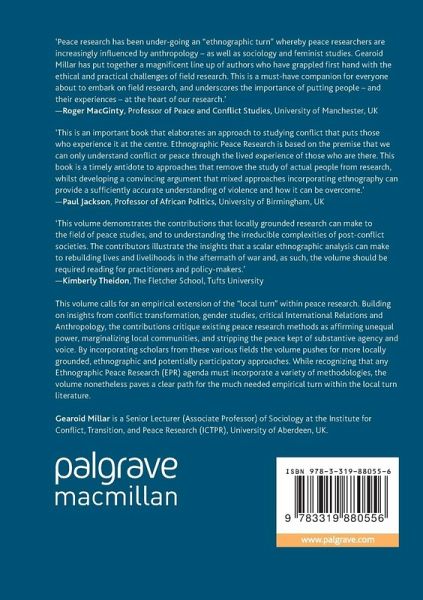 This volume calls for an empirical extension of the "local turn" within peace research. Building on insights from conflict transformation, gender studies, critical International Relations and Anthropology, the contributions critique existing peace research methods as affirming unequal power, marginalizing local communities, and stripping the peace kept of substantive agency and voice. By incorporating scholars from these various fields the volume pushes for more locally grounded, ethnographic and potentially participatory approaches. While recognizing that any Ethnographic Peace Research (EPR) agenda must incorporate a variety of methodologies, the volume nonetheless paves a clear path for the much needed empirical turn within the local turn literature.