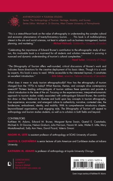 PART I: ORIENTATION Introduction. The Ethnography of Tourism: Encounter, Experience, Emergent Culture. Naomi M. Leite, Quetzil E. Castañeda, and Kathleen M. Adams PART II: POINTS OF DEPARTURE 1. {Formation} Always in Process: Edward Bruner, American Anthropology, and the Study of Tourism. Nelson Graburn and Naomi M. Leite 2. {Genealogies} On the Emergence of Identity and Borderzones as Key Concepts. Kathleen M. Adams 3. {Influence} "So in Effect I Was Studying Myself": Knowing (Our) Tourist Stories. Julia Harrison PART III: EXPLORATIONS: CONCEPTS AND DEBATES 4. {Authenticity} "Whatever We Weave Is Authentic": Coproducing Authenticity in Guatemalan Tourism Textile Markets. Walter E. Little 5. {The Borderzone} Living in and Reaching beyond the Touristic Borderzone: A View from Cuba. Valerio Simoni 6. {Constructivism} "I Can Feel Them Now, Even as I Write": Hiking Yosemite Falls with the Emergent Subjects of Tourism. Sally Ann Ness PART IV: FURTHER A