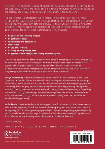Now in its fourth edition, this leading introduction to ethnography has been thoroughly updated and substantially rewritten. The volume offers a systematic introduction to ethnographic principles and practice, and includes a new chapter on 'Ethnography in the digital world'.