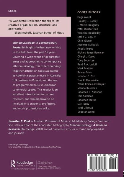 Jennifer C. Post is the author of Routledge's Ethnomusicology: A Guide to Research. She is Assistant Professor of Music at Middlebury College and Curator of the Helen Harkness Flanders Ballad Collection at Middlebury. She compiles the "Current Bibliography" and "Current Theses and Dissertations" lists published tri-yearly in the journal Ethnomusicology.