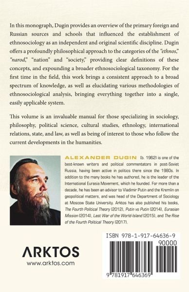 In this monograph, Dugin provides an overview of the primary foreign and Russian sources and schools that influenced the establishment of ethnosociology as an independent and original scientific discipline. Dugin offers a profoundly philosophical approach to the categories of the " ethnos," "narod," "nation" and "society," providing clear definitions of these concepts, and expounding a broader ethnosociological taxonomy. For the first time in the field, this work brings a consistent approach to a broad spectrum of knowledge, as well as elucidating various methodologies of ethnosociological analysis, bringing everything together into a single, easily applicable system. This volume is an invaluable manual for those specializing in sociology, philosophy, political science, cultural studies, ethnology, international relations, state, and law, as well as being of interest to those who follow the current developments in the humanities.