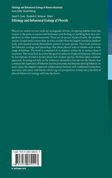 Phocid (or earless or true) seals are ecologically diverse, occupying habitats from the tropics to the poles in marine and freshwater and feeding on anything from tiny zooplankton to other marine mammals. There are 18 species of phocid seals, the smallest species (ringed seal) is more than 20 times smaller than the largest (southern elephant seal), with marked sexual dimorphism present in some species. This book examines the behavior, ecology, and physiology that allow phocid seals to inhabit such a wide range of habitats. The book is composed of 16 chapters written by 37 authors from 8 countries. The book first describes the general patterns of phocid behavior, followed by descriptions of what is known about well-studied species. We have taken a holistic approach, focusing not only on the behaviors themselves but also on the factors that constrain the expression of behavior and the proximate mechanisms driving behavior. In many cases, the chapters represent collaborations between well-established researchers and early-mid career individuals who bring new perspectives to help carry the field of phocid behavioral ecology well into the future.