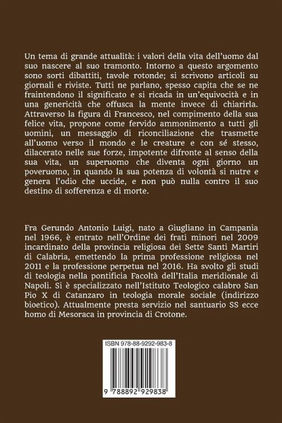 Un tema di grande attualità: i valori della vita dell'uomo dal suo nascere al suo tramonto. Intorno a questo argomento sono sorti dibattiti, tavole rotonde; si scrivono articoli su giornali e riviste. Tutti ne parlano, spesso capita che se ne fraintendono il significato e si ricada in un'equivocità e in una genericità che offusca la mente invece di chiarirla. Attraverso la figura di Francesco, nel compimento della sua felice vita, propone come fervido ammonimento a tutti gli uomini, un messaggio di riconciliazione che trasmette all'uomo verso il mondo e le creature e con sé stesso, dilacerato nelle sue forze, impotente difronte al senso della sua vita, un superuomo che diventa ogni giorno un poveruomo, in quando la sua potenza di volontà si nutre e genera l'odio che uccide, e non può nulla contro il suo destino di sofferenza e di morte.