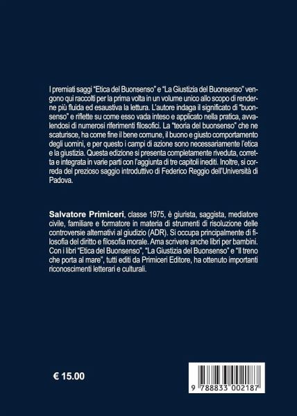 I premiati saggi "Etica del Buonsenso" e "La Giustizia del Buonsenso" vengono qui raccolti per la prima volta in un volume unico allo scopo di renderne più fluida ed esaustiva la lettura. L'autore indaga il significato di "buonsenso" e riflette su come esso vada inteso e applicato nella pratica, avvalendosi di numerosi riferimenti filosofici. La "teoria del buonsenso" che ne scaturisce, ha come fine il bene comune, il buono e giusto comportamento degli uomini, e per questo i campi di azione sono necessariamente l'etica e la giustizia. Questa edizione si presenta completamente riveduta, corretta e integrata in varie parti con l'aggiunta di tre capitoli inediti. Inoltre, si correda del prezioso saggio introduttivo di Federico Reggio dell'Università di Padova.