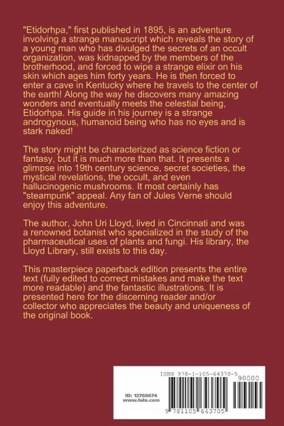 "Etidorhpa," first published in 1895, is an incredible adventure about a strange manuscript and the story of a man who divulged the secrets of an occult organization, was kidnapped by the members, and forced to go deep into a cave in Kentucky where he travels to the center of the earth! Along the way he discovers many amazing wonders and eventually meets the celestial being, Etidorhpa. His guide in his journey is a strange androgynous, humanoid being who has no eyes and blue skin! The story presents a glimpse into 19th century science, secret societies, mystical revelations, the occult, and even hallucinogenic mushrooms. It most certainly has "steampunk" appeal. Any fan of Jules Verne should enjoy this adventure. This masterpiece paperback edition presents the entire text (fully edited to correct mistakes and make the text more readable) and the fantastic illustrations. It is presented here for the discerning reader and/or collector who appreciates the beauty and uniqueness of the original book.
