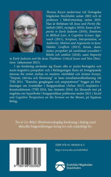 Etik och retorik i Jesustraditionen innehåller två essäer av Thomas Kazen, professor vid Enskilda Högskolan Stockholm. De två essäerna behandlar på olika sätt Jesustraditionen -- berättelser om Jesus och utsagor som tillskrivs honom -- i Markus, Matteus och Lukas. Den första fokuserar på mänskligt beteende, den andra på det figurativa språket. Bägge låter kognitionsvetenskapliga perspektiv belysa textanalyserna utifrån övertygelsen att bibeltexterna blir mer begripliga när vi tar hänsyn till hur människan fungerar, hur hennes tänkande och känsloliv utvecklats, hur hennes kropp och intellekt hänger samman, hur hennes emotioner och beteenden interagerar och hur hennes språk och handlande hör ihop. "Empati, rättvisa och försoning" är Kazens installationsföreläsning vid THS 2011. "Kameler, gengångare och amputationer" bygger på före-läsningar om överdrifter i bergspredikan (Århus 2015) respektive i Jesustraditionen (THS 2016, San Antonio 2016).