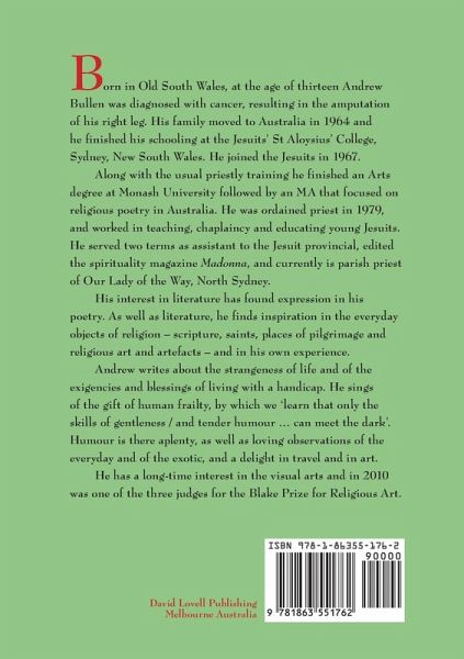 Born in Old South Wales, at the age of thirteen Andrew Bullen was diagnosed with cancer, resulting in the amputation of his right leg. His family moved to Australia in 1964 and he finished his schooling at the Jesuits' St Aloysius' College, Sydney, New South Wales. He joined the Jesuits in 1967. Along with the usual priestly training he finished an Arts degree at Monash University followed by an MA that focused on religious poetry in Australia. He was ordained priest in 1979, and worked in teaching and school administration, chaplaincy and educating young Jesuits. He served two terms as executive assistant to the Jesuit provincial, edited the spirituality magazine Madonna, and currently is parish priest of Our Lady of the Way, North Sydney. His interest in literature has found expression in his poetry. As well as literature, he finds inspiration in the everyday objects of religion - scripture, saints, places of pilgrimage and religious art and artefacts - and in his own experience. Andrew writes about the strangeness of life and of the exigencies and blessings of living with a handicap. He sings of the gift of human frailty, by which we 'learn that only the skills of gentleness / and tender humour ... can meet the dark'. Humour is there aplenty, as well as loving observations of the everyday and of the exotic, and a delight in travel and in art. He has a long-time interest in the visual arts, particularly in what is happening in our culture and its significance for presenting the Gospel today. In 2010 was one of the three judges for the Blake Prize for Religious Art.