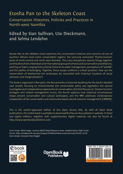 Etosha Pan to the Skeleton Coast examines the conservation histories and concerns of one of southern Africa's most iconic conservation regions: the variously connected 'Etosha-Kunene' areas of north-central and north-west Namibia. This cross-disciplinary volume brings together contributions from a Namibian and international group of scholars and conservation practitioners, working on topics ranging from colonial histories to water management, perceptions of 'wildlife' and the politics of belonging. Together, these essays confront a critical question: how can the conservation of biodiversity-rich landscapes be reconciled with historical injustices of social exclusion and marginalisation? The book is organised in five parts: the first provides a historical backdrop for the book's detailed case studies, focusing on environmental and conservation policy and legislation; the second investigates post-Independence approaches to conservation; the third focuses on 'Etosha-Kunene' ecologies and related management issues; the fourth explores how historical circumstances shape present conservation and cultural landscapes; and the fifth addresses contemporary complexities of lion conservation and community-based natural resource management (CBNRM). By offering a comprehensive overview of evolving conservation boundaries, policies and practices in the region, this timely volume paves the way for the future design of conservation initiatives that more fully consider and integrate historical and cultural knowledge and diversity. Essential reading for conservation practitioners, policymakers, and academic researchers alike, this volume also serves as a valuable resource for university students interested in conservation studies and histories of conservation.
