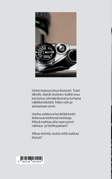 - Anton, ota kuva! Lasken katseeni. Tyrkytät minulle kameraa pöydän yli ja hymyilet tuota vastustamatonta hymyä, jota ilman sinä et olisi sinä. Se sulattaa jään ja on miljoona kertaa tehokkaampi kuin Föhrin mutta sana. Kun tartun kameraan, föhrimäinen perusilme on kadonnut kasvoiltasi. Toinen silmä hakeutuu etsimelle. Olet kuin luotu kuvattavaksi, tykkäät poseerata, eikä sinua tarvitse houkutella muikuilla tai millään juustoilla. Voisin katsella sinua ikuisesti. Tulet lähelle, täytät etsimen; kaikki muu karsiutuu ylimääräisenä ja turhana näkökentästäni. Näen vain ja ainoastaan sinut. Sormeni hakeutuu laukaisimelle. Viileä metallipinta joustaa hieman alaspäin, mutta en kuitenkaan paina sitä pohjaan, sillä haluan pitkittää nautintoani. Olet niin kaunis ja luonnollinen. Haluan raamittaa sinut näkökenttääni koko päiväksi ja katsella vain sinua. Keski-ikäinen mies Anton Tavi törmää vanhaan valokuvaan, jossa nuoruuden rakkaudella on päällään ensimmäinen hänen itsensä ostama paita - Leviksen farkkupaita. Anton haluaa yhteyden Kaarinaan ja paitansa takaisin. Alkaa etsintä, jonka aikana Anton käy läpi menneisyyttään Kaarinan kanssa, kohtaa vastoinkäymisiä ja löytää monenlaisia asioita. Mutta onko Kaarina ja farkkupaita Antonin löytämien asioiden joukossa? Kirjan teemoina on ihmissuhteet, menneisyys, kaipaus ja haaveilu.