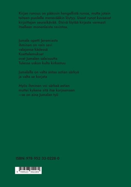 Kirjan runous on pääosin hengellistä runoa, mutta jotain taiteen puolelle menevääkin löytyy. Useat runot kuvaavat kirjoittajan seuraikävää. Etsivä löytää kirjasta varmasti itselleen monenlaista ravintoa. Jumala opetti Jeremiasta ihminen on vain savi valajansa kädessä Koettelemukset ovat Jumalan salaisuutta Tulessa uskon kulta kirkastuu Jumalalla on valta antaa astian särkyä ja valta se korjata Myös ihminen voi särkeä astian muttei kykene sitä itse korjaamaan -se on aina Jumalan työ