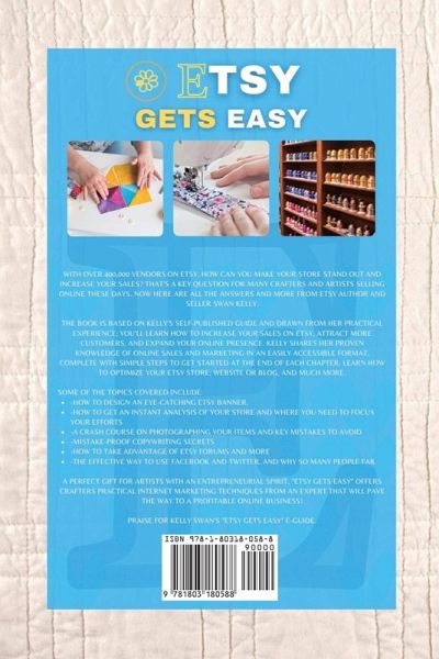 With over 400,000 vendors on Etsy, how can you make your store stand out and increase your sales? That's a key question for many crafters and artists selling online these days. Now here are all the answers and more from Etsy author and seller Swan Kelly. The Book is based on Kelly's self-published guide and drawn from her practical experience; you'll learn how to increase your sales on Etsy, attract more customers, and expand your online presence. Kelly shares her proven knowledge of online sales and marketing in an easily accessible format, complete with simple steps to get started at the end of each chapter. Learn how to optimize your Etsy store, website or blog, and much more. Some of the topics covered include:-How to design an eye-catching Etsy banner. -How to get an instant analysis of your store and where you need to focus your efforts -A crash course on photographing your items and key mistakes to avoid -Mistake-proof copywriting secrets -How to take advantage of Etsy forums and more -The effective way to use Facebook and Twitter, and why so many people fail A perfect gift for artists with an entrepreneurial spirit, "Etsy Gets Easy" offers crafters practical internet marketing techniques from an expert that will pave the way to a profitable online business! Praise for Kelly Swan's "Etsy Gets Easy" e-Guide. "This is truly a great guide through the intricate maze of internet selling. It is so easy to follow and straightforward..." --- Etsy seller Jennifer Laws. "I have definitely seen a difference in my sales after doing many of the things suggested." --- Etsy seller mishnishmarket "A real wealth of useful information." --- Etsy seller elemental "[The steps are] presented easily, so making changes to your store can be done instantly while you're reading." -- Mark Drake, SuperGoLicky Custom Silver Jewelry "A tremendous amount of information. I have learned more from [this book] than anything I have purchased in five years." --- EtsyGifts Seller