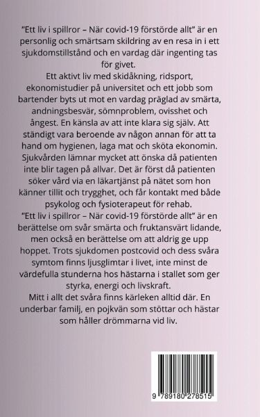 "Ett liv i spillror - När covid-19 förstörde allt" är en personlig och smärtsam skildring av en resa in i ett sjukdomstillstånd och en vardag där ingenting tas för givet. Ett aktivt liv med skidåkning, ridsport, ekonomistudier på universitet och ett arbete som bartender byts ut mot en vardag präglad av smärta, andningsbesvär, hjälprtklappningar, sömnproblem, ovisshet och ångest. En känsla av att inte klara sig själv. Att ständigt vara beroende av någon annan för att ta hand om sig själv och sin ekonomi. Sjukvården lämnar mycket att önska då patienten inte blir tagen på allvar.