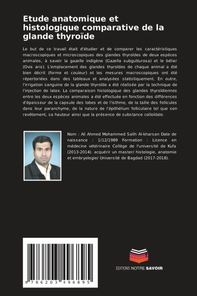 Le but de ce travail était d'étudier et de comparer les caractéristiques macroscopiques et microscopiques des glandes thyroïdes de deux espèces animales, à savoir la gazelle indigène (Gazella subgutturosa) et le bélier (Ovis aris). L'emplacement des glandes thyroïdes de chaque animal a été bien décrit (forme et couleur) et les mesures macroscopiques ont été répertoriées dans des tableaux et analysées statistiquement. En outre, l'irrigation sanguine de la glande thyroïde a été réalisée par la technique de l'injection de latex. La comparaison histologique des glandes thyroïdiennes entre les deux espèces animales a été effectuée en fonction des différences d'épaisseur de la capsule des lobes et de l'isthme, de la taille des follicules dans leur paranchyme, de la nature de l'épithélium folliculaire tel que son revêtement, sa hauteur ainsi que la présence de substance colloïdale.