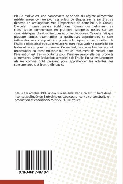 L huile d olive est une composante principale du régime alimentaire méditerranéen connue pour ses effets bénéfiques sur la santé et sa richesse en antioxydants. Vue l importance de cette huile, le Conseil Oléicole Internationale a établit des normes qui définissent sa classification commerciale en plusieurs catégories basées sur ses caractéristiques physicochimiques et organoleptiques. Ce qui a fait que plusieurs études quantitatives et qualitatives approfondies se sont intéressées aux compositions physico-chimiques et sensorielles de l huile d olive, ainsi qu aux corrélations entre l évaluation sensorielle des huiles et les composants mineurs. Cependant, peu de recherches se sont préoccupées du consommateur qui est un instrument de mesure dont l évaluation est très importante pour l analyse sensorielle des produits alimentaires. Cette évaluation sensorielle de l huile d olive est largement utilisée comme outil puissant pour appréhender les attentes des consommateurs et leurs préférences.