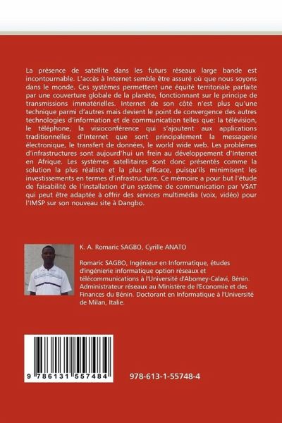 La présence de satellite dans les futurs réseaux large bande est incontournable. L'accès à Internet semble être assuré où que nous soyons dans le monde. Ces systèmes permettent une équité territoriale parfaite par une couverture globale de la planète, fonctionnant sur le principe de transmissions immatérielles. Internet de son côté n'est plus qu'une technique parmi d'autres mais devient le point de convergence des autres technologies d'information et de communication telles que: la télévision, le téléphone, la visioconférence qui s'ajoutent aux applications traditionnelles d'Internet que sont principalement la messagerie électronique, le transfert de données, le world wide web. Les problèmes d'infrastructures sont aujourd'hui un frein au développement d'Internet en Afrique. Les systèmes satellitaires sont donc présentés comme la solution la plus réaliste et la plus efficace, puisqu'ils minimisent les investissements en termes d'infrastructure. Ce mémoire a pour but l'étude de faisabilité de l'installation d'un système de communication par VSAT qui peut être adaptée à offrir des services multimédia (voix, vidéo) pour l'IMSP sur son nouveau site à Dangbo.