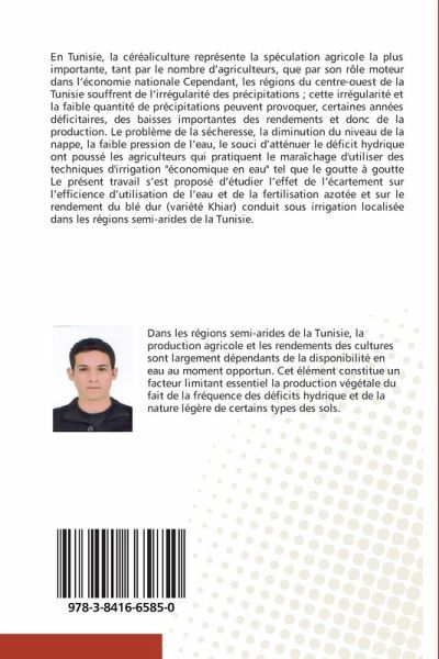 En Tunisie, la céréaliculture représente la spéculation agricole la plus importante, tant par le nombre d'agriculteurs, que par son rôle moteur dans l'économie nationale Cependant, les régions du centre-ouest de la Tunisie souffrent de l'irrégularité des précipitations ; cette irrégularité et la faible quantité de précipitations peuvent provoquer, certaines années déficitaires, des baisses importantes des rendements et donc de la production. Le problème de la sécheresse, la diminution du niveau de la nappe, la faible pression de l'eau, le souci d'atténuer le déficit hydrique ont poussé les agriculteurs qui pratiquent le maraîchage d'utiliser des techniques d'irrigation "économique en eau" tel que le goutte à goutte Le présent travail s'est proposé d'étudier l'effet de l'écartement sur l'efficience d'utilisation de l'eau et de la fertilisation azotée et sur le rendement du blé dur (variété Khiar) conduit sous irrigation localisée dans les régions semi-arides de la Tunisie.