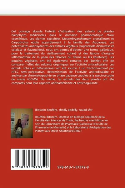 Cet ouvrage aborde l''intérêt d''utilisation des extraits de plantes halophytes médicinales dans le domaine pharmaceutique et/ou cosmétique. Les plantes exploitées Mesembryanthemum crystallinum et Carpobrotus edulis appartiennent à la famille des Aizoaceae. Les potentialités antioxydantes des extraits végétaux (superoxyde dismutase et catalase et flavonoïdes), nous ont permis d''obtenir une forme galénique, pour le traitement du vieillissement cutané et des lésions d''origine inflammatoire de la peau (les fibroses du derme ou les kératoses). Les poudres végétales ont été également extraites par Soxhlet afin de comparer l''effet des solvants organiques sur l''activité antiradicalaire. Les extraits riches en bétacyanines ont été soumis à un fractionnement par HPLC semi-préparative, détermination de l''activité antiradicalaire et analyse par chromatographie en phase gazeuse couplée à la spectroscopie de masse (GCMS). De même, les extraits des deux plantes ont été comparés pour leur capacité antibactérienne et anticoagulante.