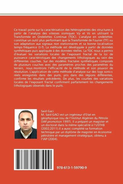 Ce travail porte sur la caractérisation des hétérogénéités des structures à partir de l'analyse des vitesses sismiques Vp et Vs en utilisant la Transformée en Ondelettes Continue (TOC). L'analyse en ondelettes constitue un outil plus performant que la Transformée de Fourier (TF) vu son adaptation aux signaux non stationnaires et sa bonne localisation temps-fréquence (t-f). La méthode est développée à partir de données synthétiques puis appliquée à des données réelles. La TOC nous a permis d'évaluer les variations locales de l'exposant fractal de la loi de puissance caractéristiques des changements lithologiques au sein des différentes couches. Sur des modèles fractales synthétiques composés de plusieurs couches avec des paramètres proches des paramètres du terrain, nous montrons l'efficacité de la méthode et son pouvoir de résolution. L'application de cette méthode d'analyse sur des logs sonics réels enregistrés dans des puits, pris dans des régions différentes, confirme les résultats précédents. De plus, les courbes des variations locales de l'exposant fractal confirment parfaitement les changements lithologiques observés dans le puits.