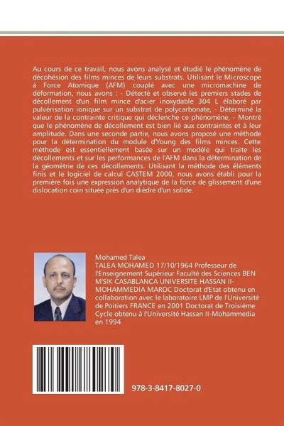Au cours de ce travail, nous avons analysé et étudié le phénomène de décohésion des films minces de leurs substrats. Utilisant le Microscope à Force Atomique (AFM) couplé avec une micromachine de déformation, nous avons : - Détecté et observé les premiers stades de décollement d'un film mince d'acier inoxydable 304 L élaboré par pulvérisation ionique sur un substrat de polycarbonate, - Déterminé la valeur de la contrainte critique qui déclenche ce phénomène, - Montré que le phénomène de décollement est bien lié aux contraintes et à leur amplitude. Dans une seconde partie, nous avons proposé une méthode pour la détermination du module d'Young des films minces. Cette méthode est essentiellement basée sur un modèle qui traite les décollements et sur les performances de l'AFM dans la détermination de la géométrie de ces décollements. Utilisant la méthode des éléments finis et le logiciel de calcul CASTEM 2000, nous avons établi pour la première fois une expression analytique de la force de glissement d'une dislocation coin située prés d'un dièdre d'un solide.