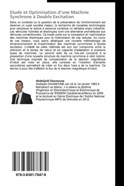 Dans un contexte ou la question de la préservation de l environnement est devenue un sujet sociétal majeur, la recherche de nouvelles technologies pour remplacer la voiture à essence constitue un véritable enjeu industriel. Les véhicules hybrides et électriques sont une alternative prometteuse aux véhicules conventionnels. Ce travail porte sur la conception et l optimisation des machines électriques pour la motorisation de ces voitures. Au cours de ces travaux, nous avons développé une nouvelle méthodologie de dimensionnement et d optimisation des machines synchrones à double excitation. L intérêt de cette méthode est son bon compromis entre la précision et le temps de calcul et sa capacité d adaptation à plusieurs types de machines. Le second volet de ce livre est consacré à la proposition d une nouvelle structure de machine synchrone à rotor bobiné. Une technique originale de compensation de la réaction magnétique d induit est mise en place, elle consiste en l insertion d aimants secondaires permettant de créer un flux dans l axe q de la machine. Ce dernier a pour rôle d affaiblir le flux de la réaction magnétique d induit.