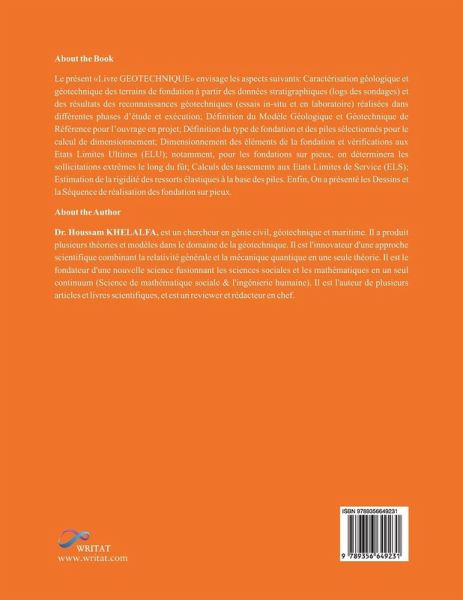 Le présent Livre GEOTECHNIQUE envisage les aspects suivants: Caractérisation géologique et géotechnique des terrains de fondation à partir des données stratigraphiques (logs des sondages) et des résultats des reconnaissances géotechniques (essais in-situ et en laboratoire) réalisées dans différentes phases d'étude et exécution; Définition du Modèle Géologique et Géotechnique de Référence pour l'ouvrage en projet; Définition du type de fondation et des piles sélectionnés pour le calcul de dimensionnement; Dimensionnement des éléments de la fondation et vérifications aux Etats Limites Ultimes (ELU); notamment, pour les fondations sur pieux, on déterminera les sollicitations extrêmes le long du fût; Calculs des tassements aux Etats Limites de Service (ELS); Estimation de la rigidité des ressorts élastiques à la base des piles. Enfin, On a présenté les Dessins et la Séquence de réalisation des fondation sur pieux.