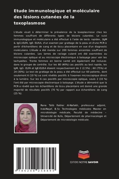 L'étude visait à déterminer la prévalence de la toxoplasmose chez les femmes souffrant de différents types de lésions cutanées. Le suivi immunologique et moléculaire a été effectué à l'aide de tests rapides, (IgM & IgG)-ELFA, IgE- ELISA, d'un examen par grattage de la peau et d'une PCR à partir d'échantillons de sang et de tissu placentaire en vue d'un diagnostic moléculaire. L'étude a été menée sur 200 femmes enceintes souffrant de lésions cutanées. Les lames de raclage cutané ont été examinées au microscope optique et au microscope électronique à balayage pour voir les tachyzoïtes. Trente femmes en bonne santé ont également été incluses dans le groupe de contrôle. Sur les 80 (40%) cas positifs au test rapide, les IgM, IgG- ELFA et IgE-ELISA étaient respectivement de 2 (2,5%) ; 60 (75%) et 24 (30%). Le test de grattage de la peau a été effectué sur 60 patients, dont seulement 6 (10 %) se sont révélés positifs à l'examen microscopique direct à la lumière. Sur les 6 cas positifs par microscopie optique, seuls 2 (33 %) l'ont été par microscopie électronique à balayage. L'étude a démontré que la PCR a révélé que les échantillons de tissu placentaire ont donné une grande majorité de résultats positifs (70 %) par rapport aux échantillons de sang (25 %).