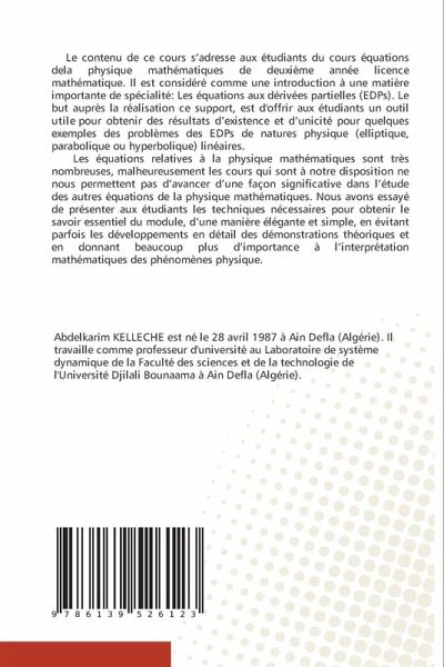 Le contenu de ce cours s'adresse aux étudiants du cours équations dela physique mathématiques de deuxième année licence mathématique. Il est considéré comme une introduction à une matière importante de spécialité: Les équations aux dérivées partielles (EDPs). Le but auprès la réalisation ce support, est d'offrir aux étudiants un outil utile pour obtenir des résultats d'existence et d'unicité pour quelques exemples des problèmes des EDPs de natures physique (elliptique, parabolique ou hyperbolique) linéaires. Les équations relatives à la physique mathématiques sont très nombreuses, malheureusement les cours qui sont à notre disposition ne nous permettent pas d'avancer d'une façon significative dans l'étude des autres équations de la physique mathématiques. Nous avons essayé de présenter aux étudiants les techniques nécessaires pour obtenir le savoir essentiel du module, d'une manière élégante et simple, en évitant parfois les développements en détail des démonstrations théoriques et en donnant beaucoup plus d'importance à l'interprétation mathématiques des phénomènes physique.