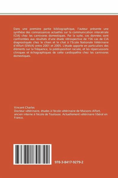 Dans une première partie bibliographique, l'auteur présente une synthèse des connaissances actuelles sur la communication interatriale (CIA) chez les carnivores domestiques. Par la suite, ces données sont confrontées aux résultats d'une étude rétrospective de 156 cas de CIA diagnostiqués chez le chien et le chat à l'Ecole Nationale Vétérinaire d'Alfort (ENVA) entre 2001 et 2005. L'étude apporte en particuliers des éléments sur la fréquence, la prédisposition raciale, et les répercussions cliniques et échographiques de cette cardiopathie chez les carnivores domestiques.