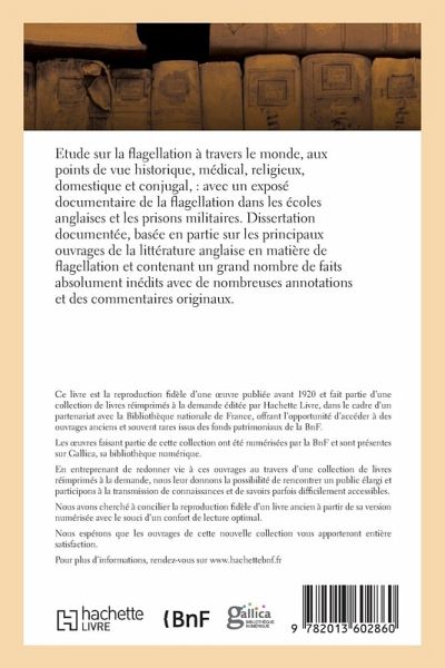 Etude sur la flagellation à travers le monde, aux points de vue historique, médical, religieux, domestique et conjugal: avec un exposé documentaire de la flagellation dans les écoles anglaises et les prisons militaires. Dissertation documentée, basée en partie sur les principaux ouvrages de la littérature anglaise en matière de flagellation et contenant un grand nombre de faits absolument inédits avec de nombreuses annotations et des commentaires originaux. Date de l'édition originale: 1899 Le présent ouvrage s'inscrit dans une politique de conservation patrimoniale des ouvrages de la littérature Française mise en place avec la BNF. HACHETTE LIVRE et la BNF proposent ainsi un catalogue de titres indisponibles, la BNF ayant numérisé ces oeuvres et HACHETTE LIVRE les imprimant à la demande. Certains de ces ouvrages reflètent des courants de pensée caractéristiques de leur époque, mais qui seraient aujourd'hui jugés condamnables. Ils n'en appartiennent pas moins à l'histoire des idées en France et sont susceptibles de présenter un intérêt scientifique ou historique. Le sens de notre démarche éditoriale consiste ainsi à permettre l'accès à ces oeuvres sans pour autant que nous en cautionnions en aucune façon le contenu. Pour plus d'informations, rendez-vous sur www.hachettebnf.fr