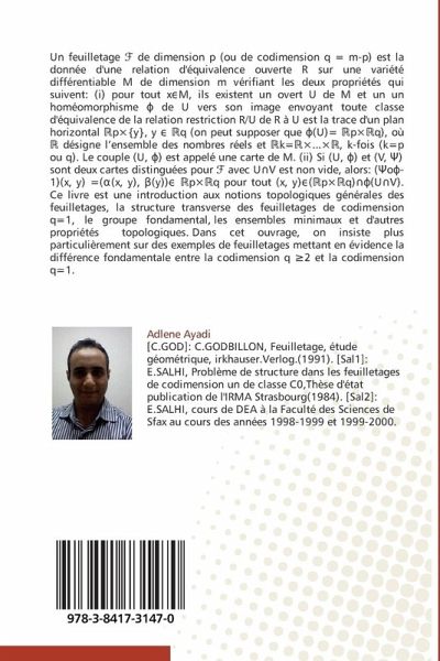 Un feuilletage de dimension p (ou de codimension q = m-p) est la donnée d'une relation d'équivalence ouverte R sur une variété différentiable M de dimension m vérifiant les deux propriétés qui suivent: (i) pour tout x M, ils existent un overt U de M et un un homéomorphisme de U vers son image envoyant toute classe d'équivalence de la relation restriction R/U de R à U est la trace d'un plan horizontal p×{y}, y q (on peut supposer que (U)= p× q), où désigne l ensemble des nombres réels et k= ×...× , k-fois (k=p ou q). Le couple (U, ) est appelé une carte de M. (ii) Si (U, ) et (V, ) sont deux cartes distinguées pour avec U V est non vide, alors: ( o -1)(x, y) =( (x, y), (y)) p× q pour tout (x, y) ( p× q) (U V). Ce livre est une introduction aux notions topologiques générales des feuilletages, la structure transverse des feuilletages de codimension q=1, le groupe fondamental, les ensembles minimaux et d'autres propriétés topologiques. Dans cet ouvrage, on insiste plus particulièrement sur des exemples de feuilletages mettant en évidence la différence fondamentale entre la codimension q 2 et la codimension q=1.